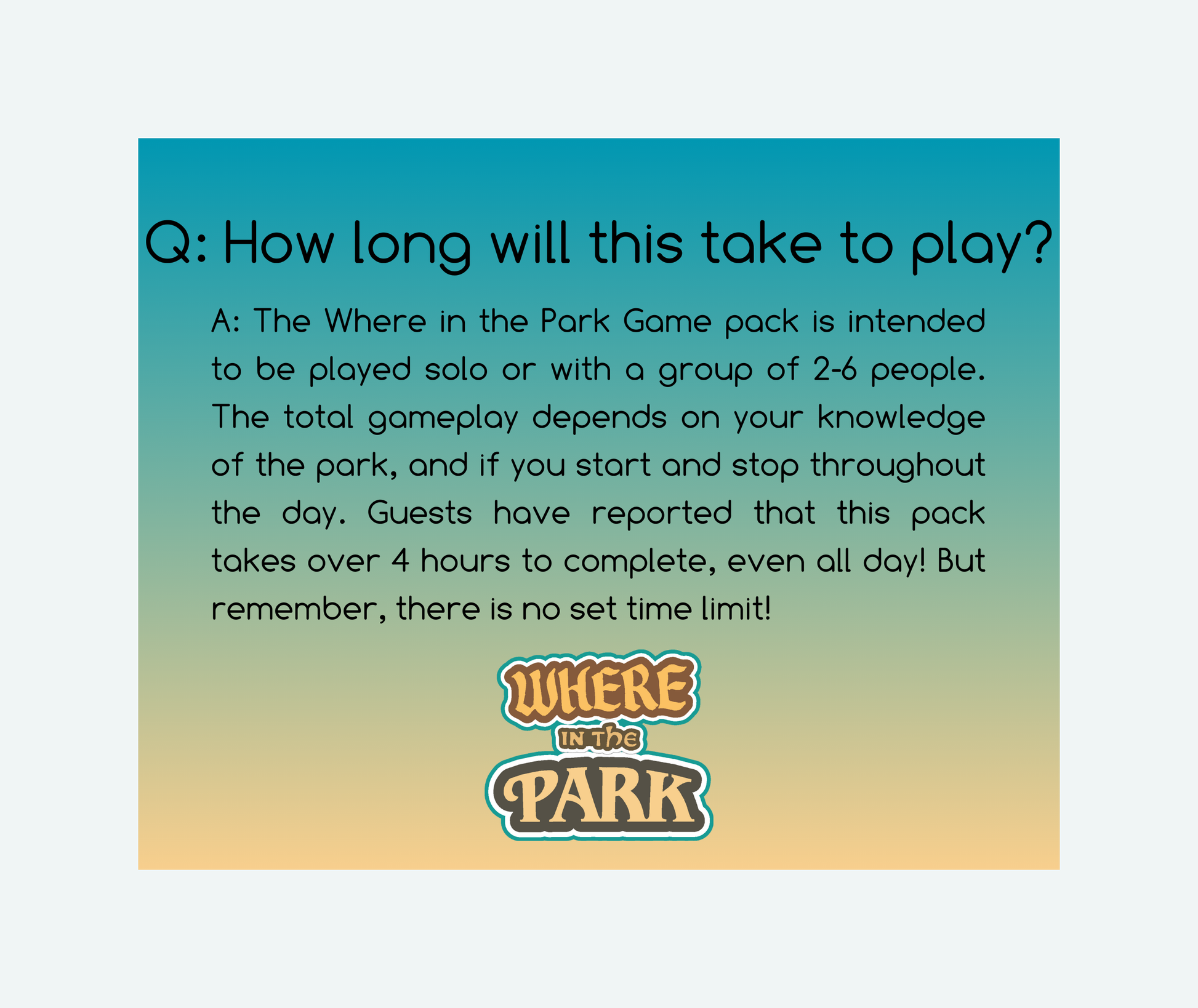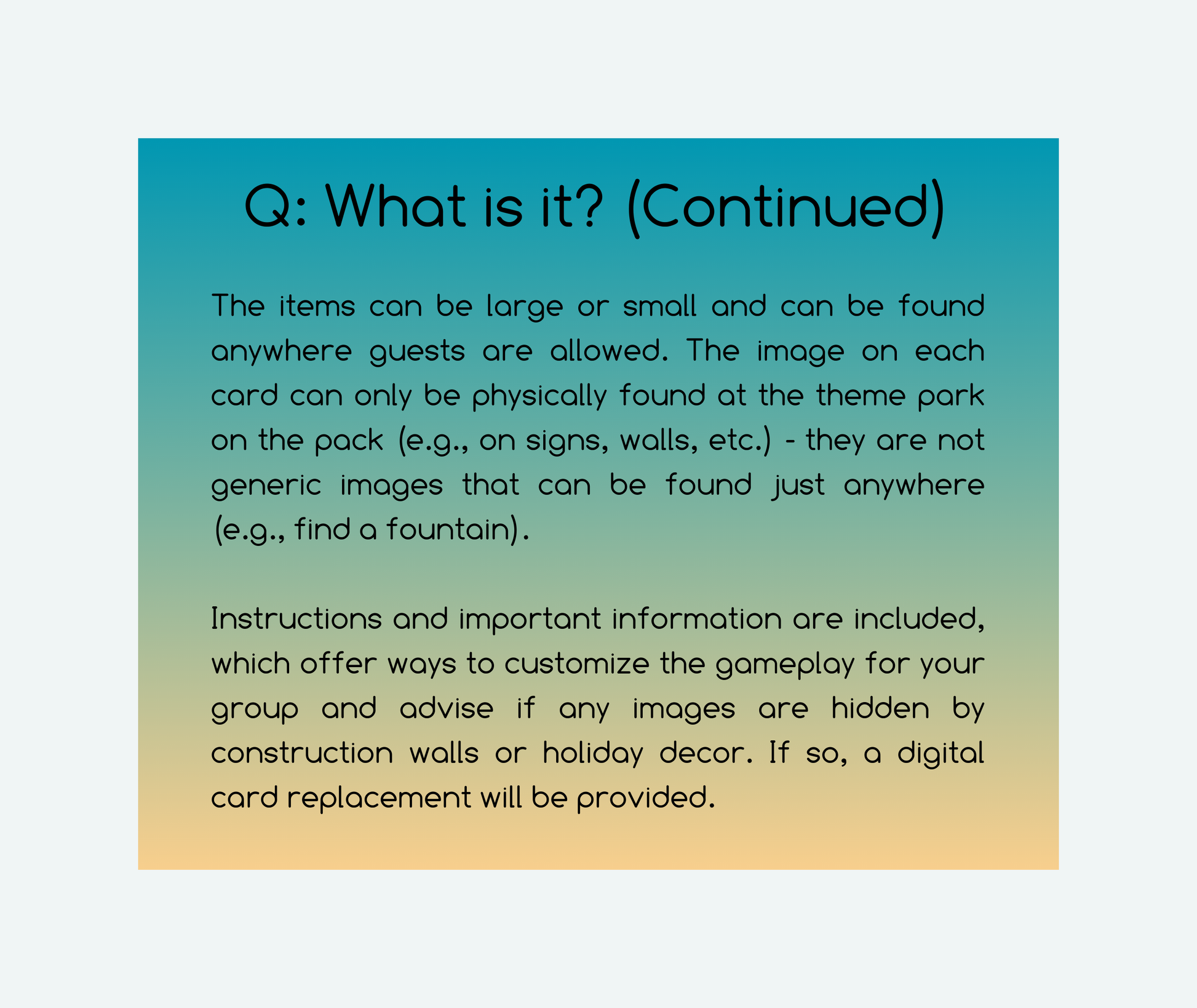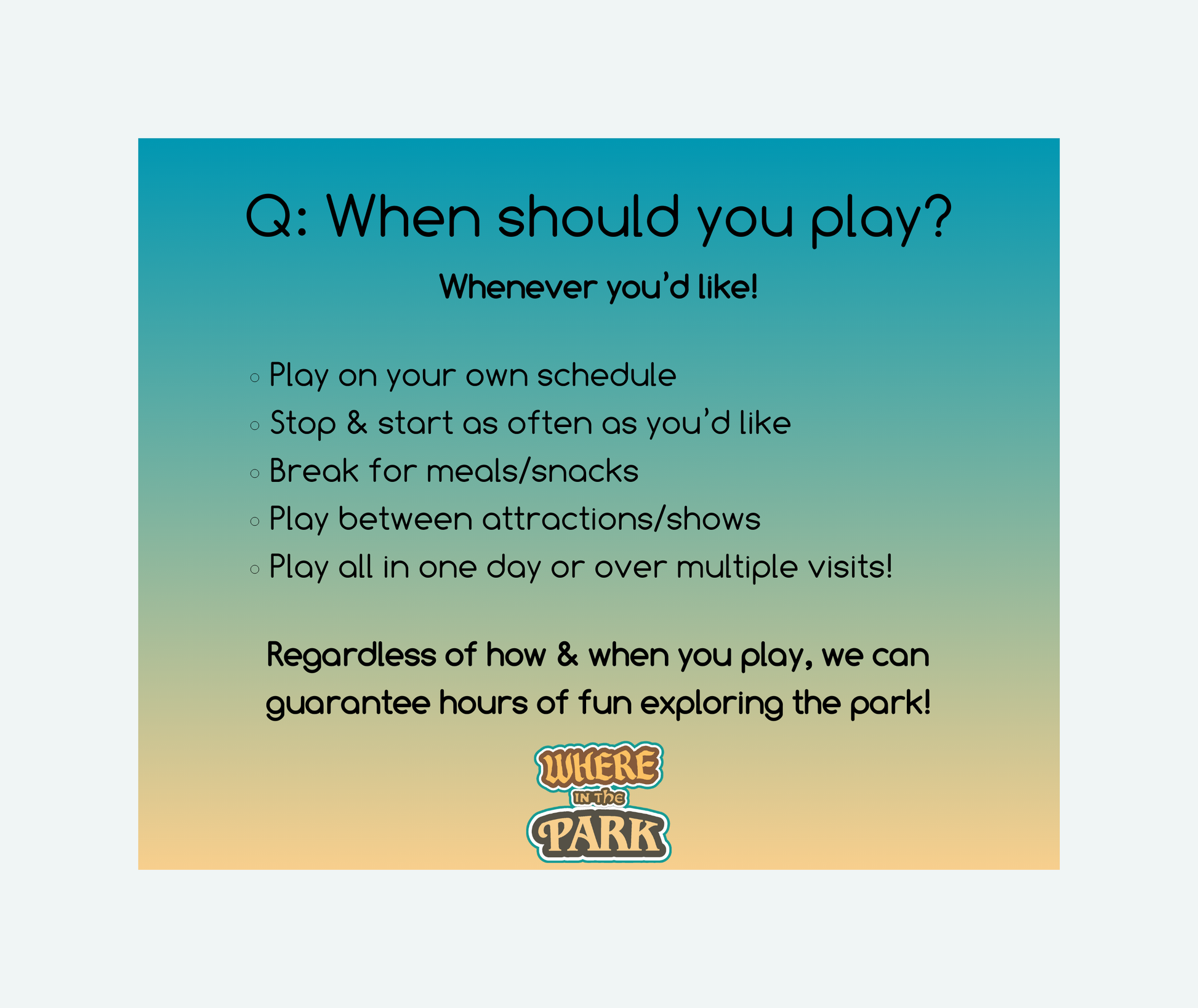 When to play: Whenever you'd like! Feel free to start and stop, break for lunch, play between attractions or shows, or play over multiple days! Other players have said they take 5 cards with them during each visit and make it their mission to find those 5 before moving on to the next set of cards. Regardless of how you choose to play, we can guarantee hours of fun exploring the park!