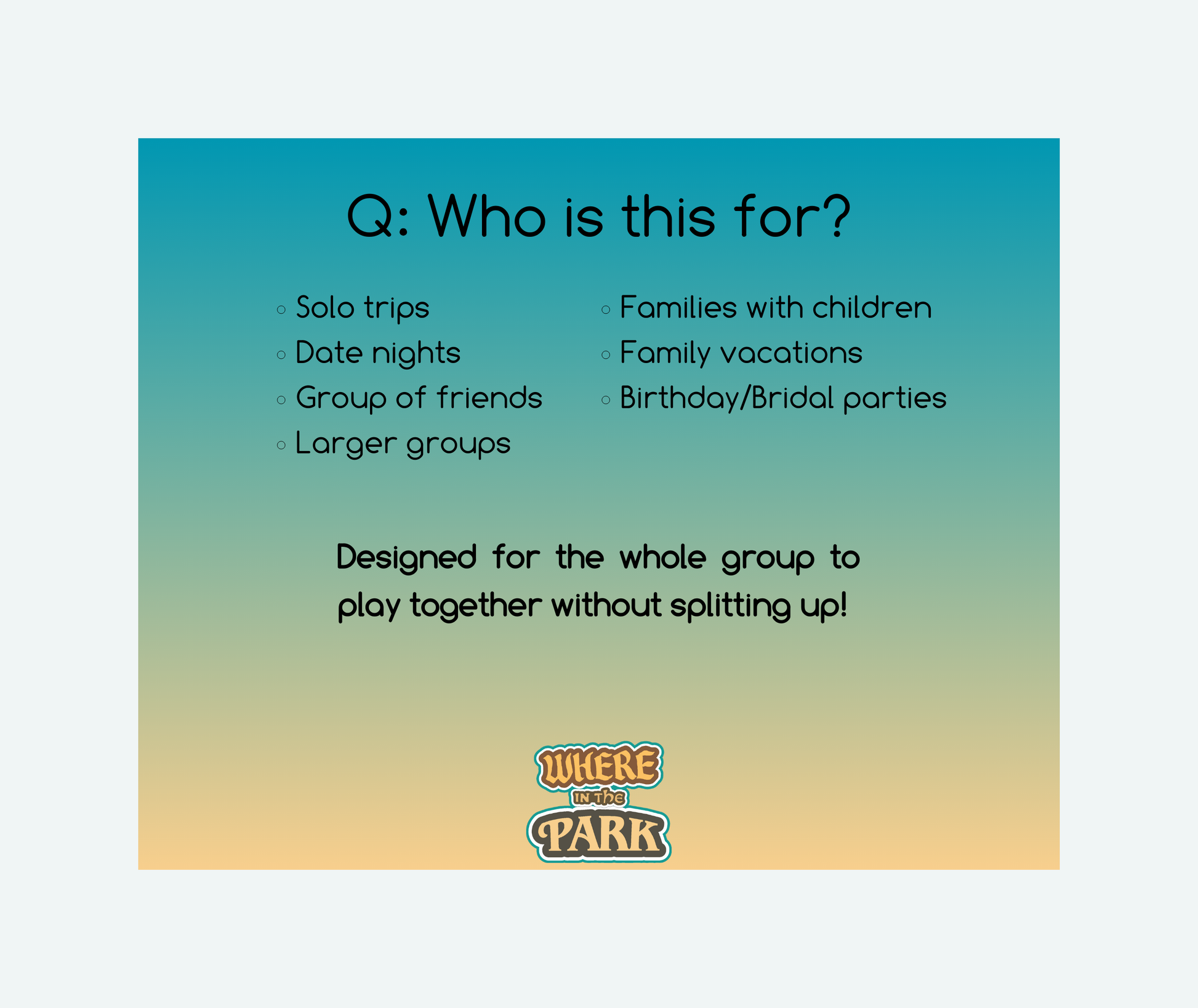 Who this is for: Our packs are fun for the whole family, from ages 5 to 105, and are great for a solo trip, date night, group of friends, families with children, larger families or groups, family vacations, bridal parties, or birthday parties! These packs are designed for the whole group to play together without splitting up!